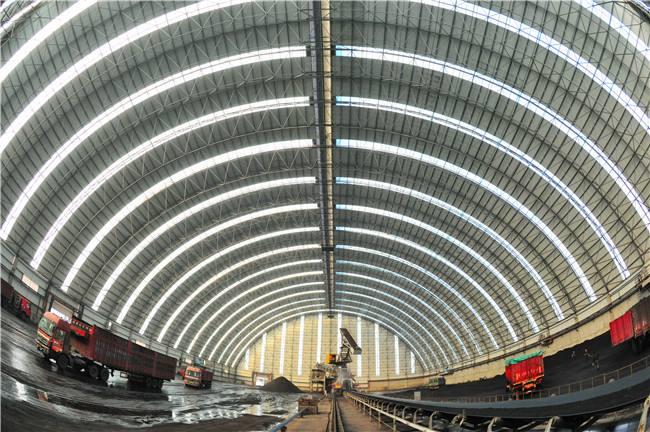 堆场料场封闭式主体结构为新型的钢红桥网架结构,维修结构为红桥钢结构红桥不锈钢板和纤维增强塑料灯具,其外形以红桥网架式和平板为主,连接柱红桥施工自由,设置喷雾自动喷水系统,从而可以实现棚内所有物料的覆盖,减少物料在运输过程中的损耗,起到防尘的作用,减少工厂关闭后的二氧化硫排放量,50mg/m3颗粒排放量小于10mg/m3,非常适合低能耗。低闭库自动感应反应对库存轮胎进行清洁,确保轮胎不受道路污染;封闭的储存区可从源头控制粉尘污染,控制无序排放。